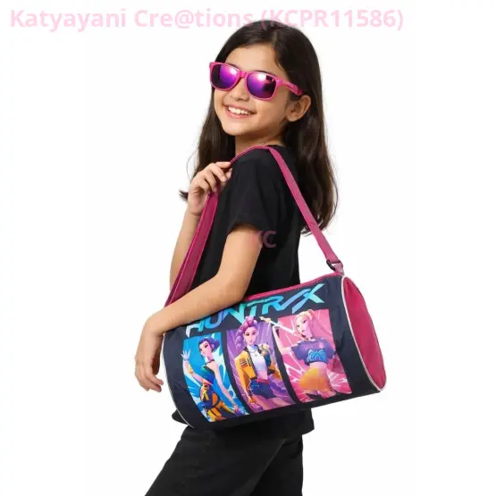 Let your little one travel in style with the Demons Hunters Kids Duffel Bag from Katyayani Creations. This eye-catching duffel bag features cool anime-inspired character prints on a navy and pink design that kids will love.