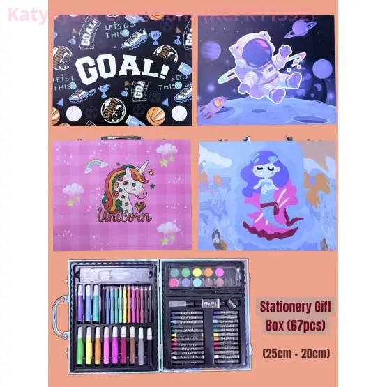 Complete 67-piece Stationery Gift Box Art Kit (25x20cm) with crayons, watercolors, markers, color pencils, and more. Available in 4 fun theme designs including Sports, Space, Unicorn, and Mermaid. The ultimate creative gift for young artists.