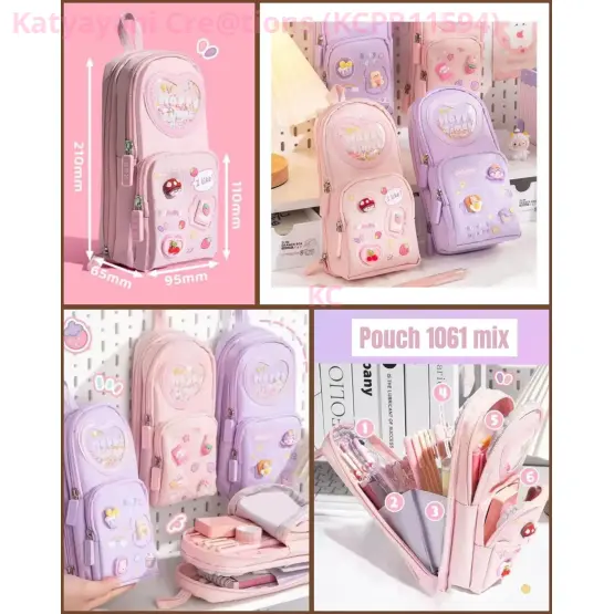 Adorable Three Layer School Bag-Shaped Pencil Pouch in cute pink and purple designs. Features 6 compartments for organized storage, heart-shaped window, and kawaii decorations. Large capacity stationery organizer perfect for girls.