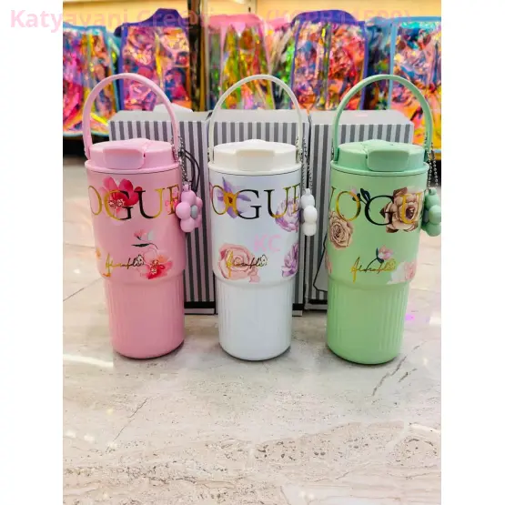 Stylish Vogue Tumbler Style Double-Wall Tumbler 750ml with straw and carry handle. Features elegant floral prints in beautiful pastel colors - pink, white, and green. Trendy and insulated for everyday use.